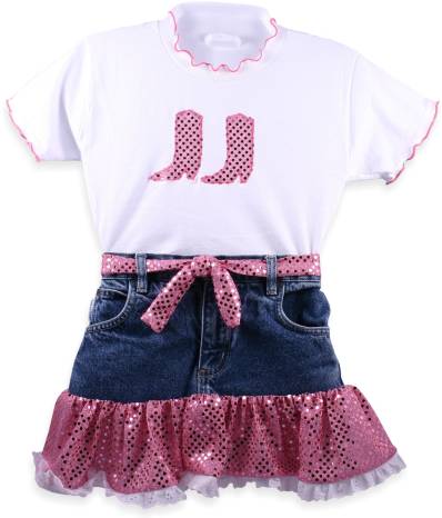 Denim and pink sequin skirt trimmed with eyelet lace. 2 sequin boot emblems on white short sleeve T-shir with matching belt. The back of the denim skirt has a white bow.