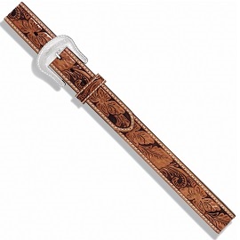1 1/2" This belt has an allover floral tooled pattern. Made of top grain leather, that is durable and flexible for a perfect fit. Removable silver plated engraved buckle: