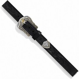1 1/2" full grain leather strap and keeper, tooled details, antique two-tone buckle set: